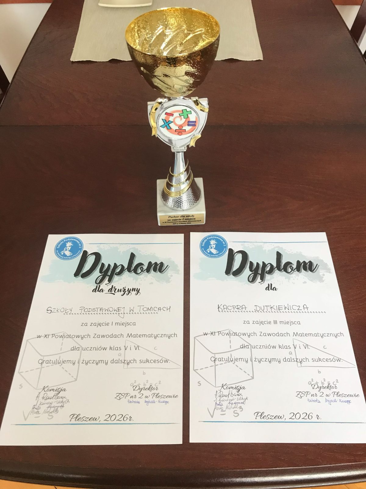 21 kwietnia 2024 r. w Szkole Podstawowej nr 2 im. Królowej Jadwigi w Pleszewie odbyły się XI Powiatowe Zawody Matematyczne dla uczniów kl. V i VI szkół podstawowych, w których udział brały trzyosobowe zespoły z 14 szkół z powiatu pleszewskiego (42 uczestników). Z naszej szkoły w zawodach wzięli udział uczniowie klasy szóstej: Nikola Jankowska, Szymon Dyoniziak i Kacper Dutkiewicz. Nasi uczniowi osiągnęli duży sukces, ponieważ zajęli 1 miejsce drużynowo, a Kacper Dutkiewicz dodatkowo 3 miejsce indywidualnie.